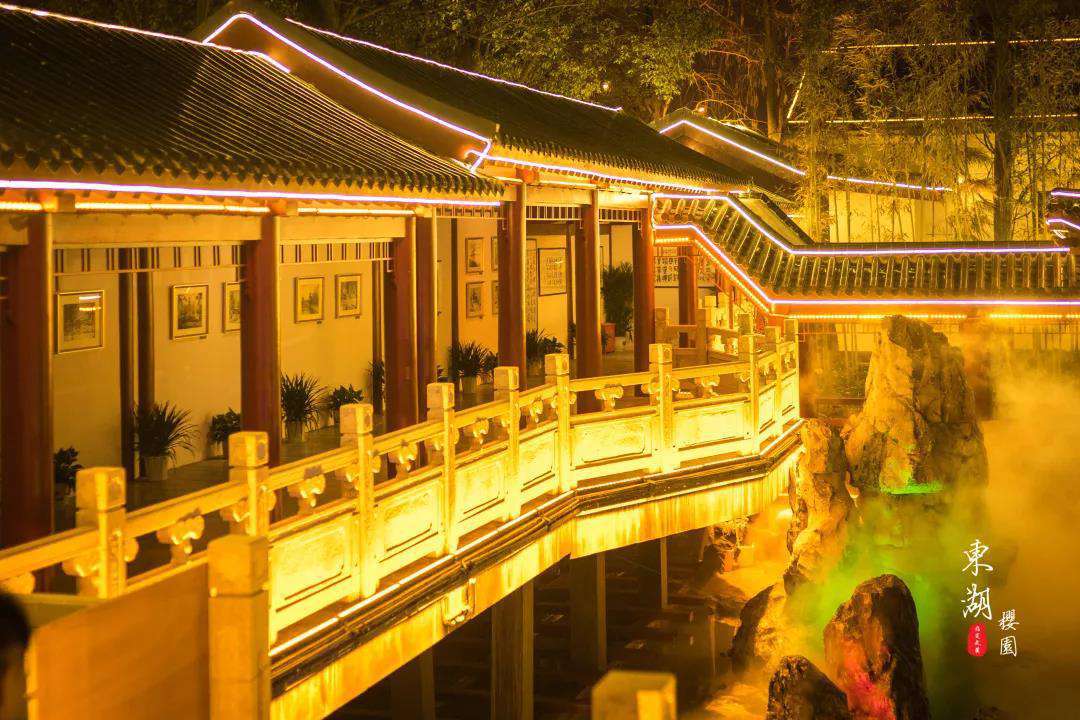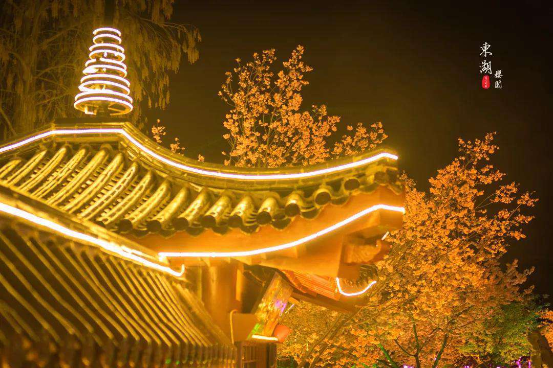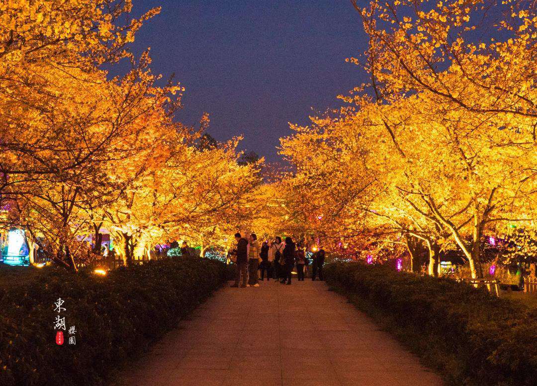 看过了白天满园柔情的樱花,夜色中灯光下的东湖樱花园则焕发出别样的韵味。