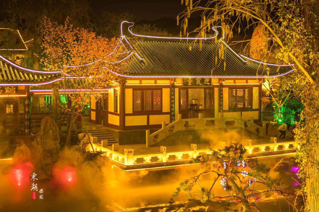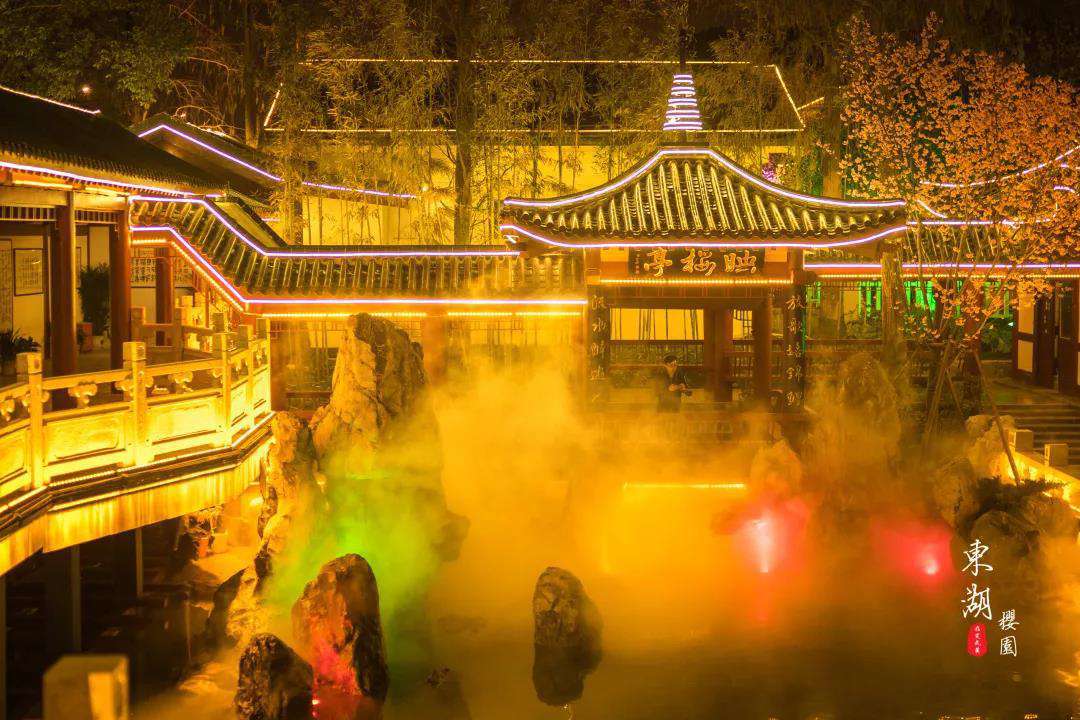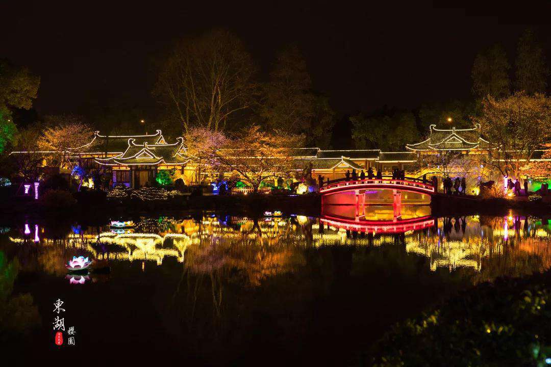 今年东湖樱花园内有9000多套夜间灯组,灯笼500个,LED瓦楞灯,1200套,点光源2100套,璨华景观户外七彩RGB投光灯200套,休息区和经心书院在今年都将亮起来,还有八面大鼓威风的摆放在草坪上。