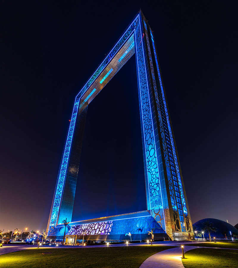 380套璨华照明生产的景观投光灯 4 RGBW泛光灯与34套LED投光灯点亮了迪拜之框的建筑外立面,为建筑的外部长距离结构提供了高品质的照明效果。