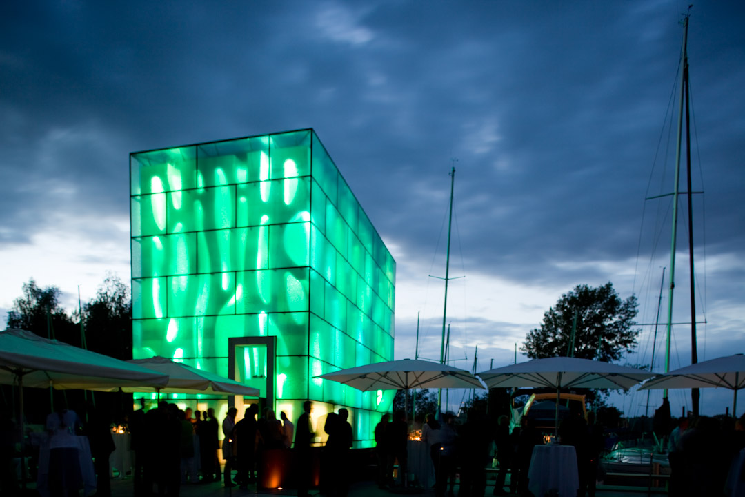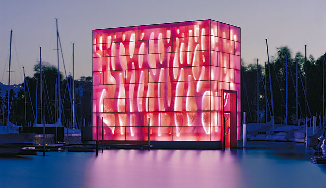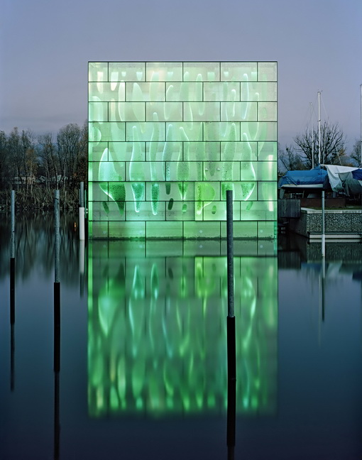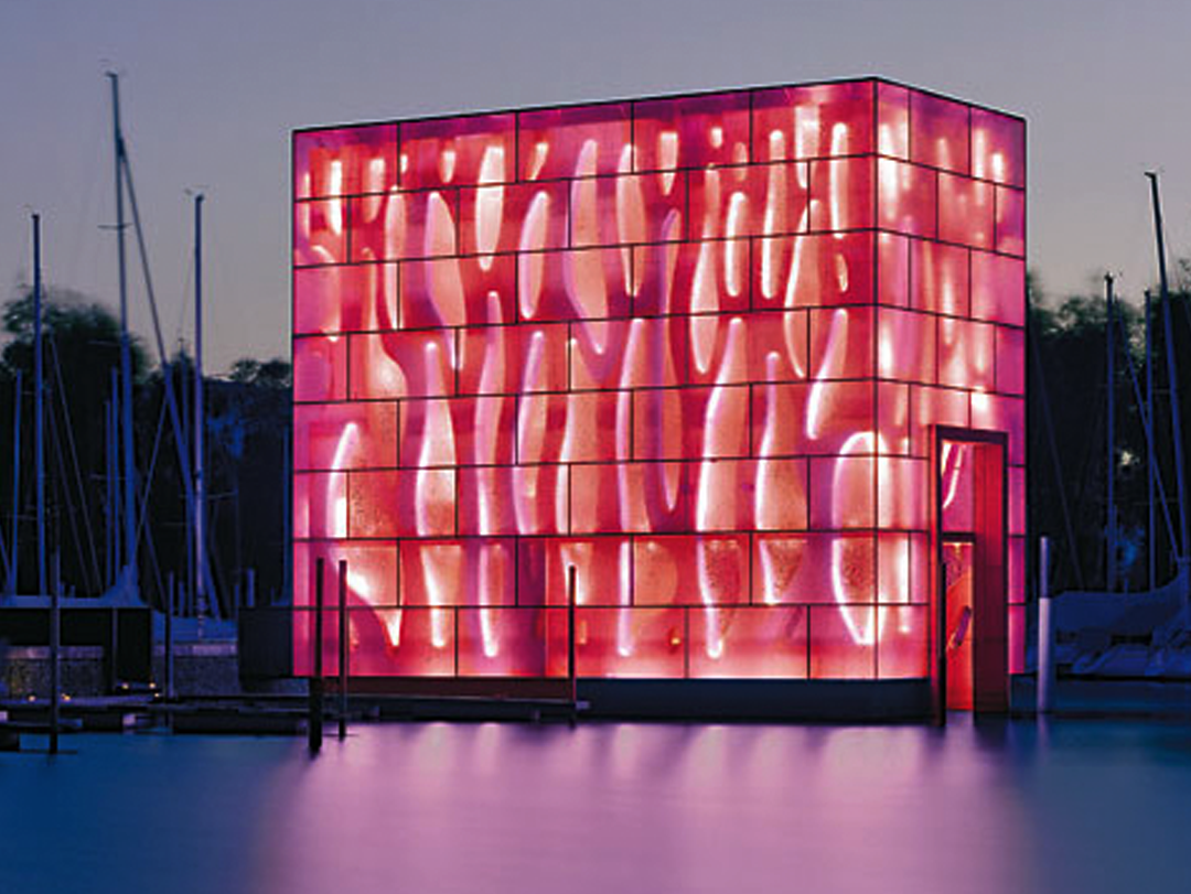 诺德韦斯特豪斯作为港口帆船社区的新聚会点。设计师令起支撑作用的混凝土元素和外围的玻璃之间产生了惊人的相互,使得建筑物的内部轮廓得以被照见。混凝土构件的不规则结构与玻璃板的规则矩形形态相映成趣。灯光色彩的随机性则避免了核心和外壳之间过于鲜明的对比。