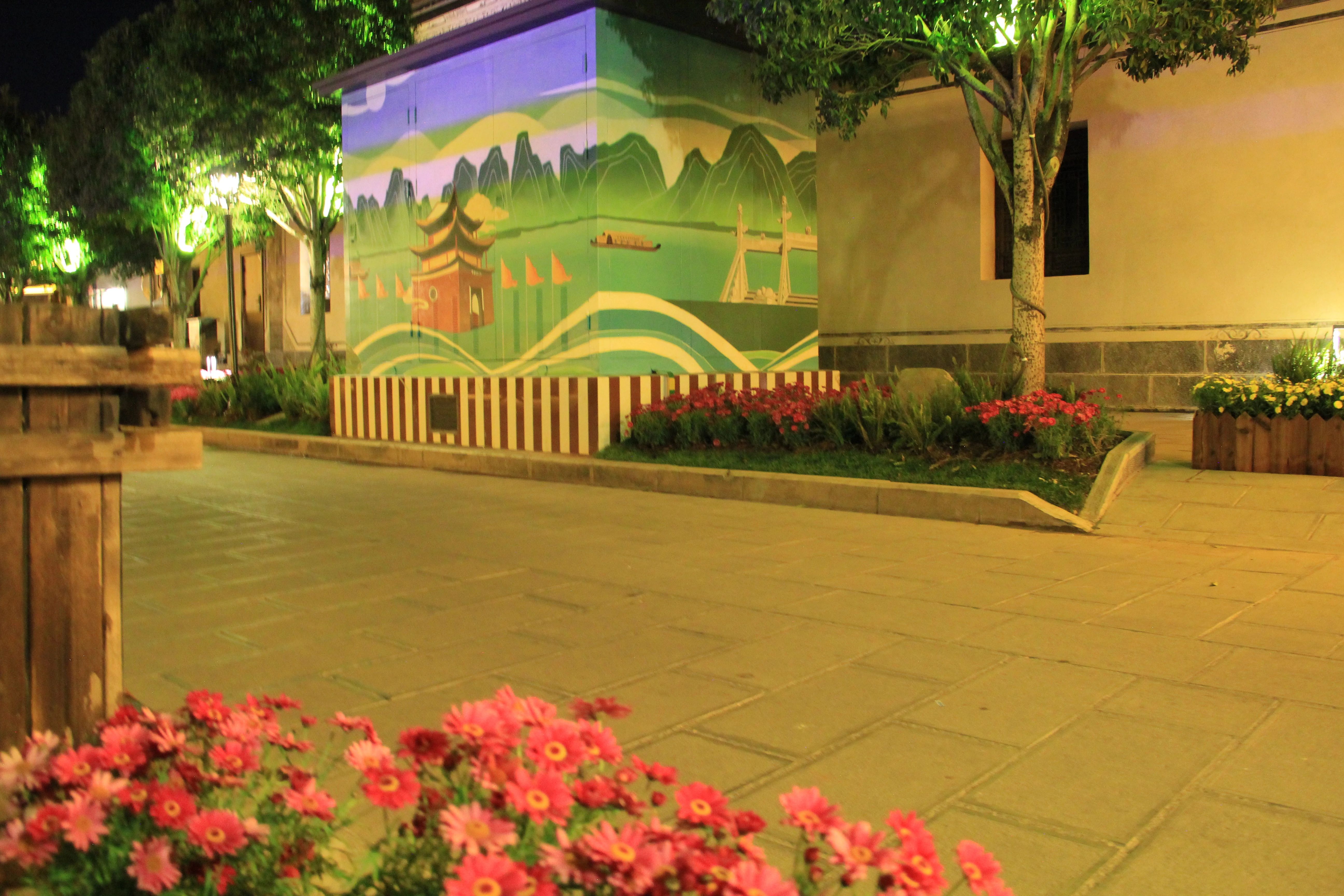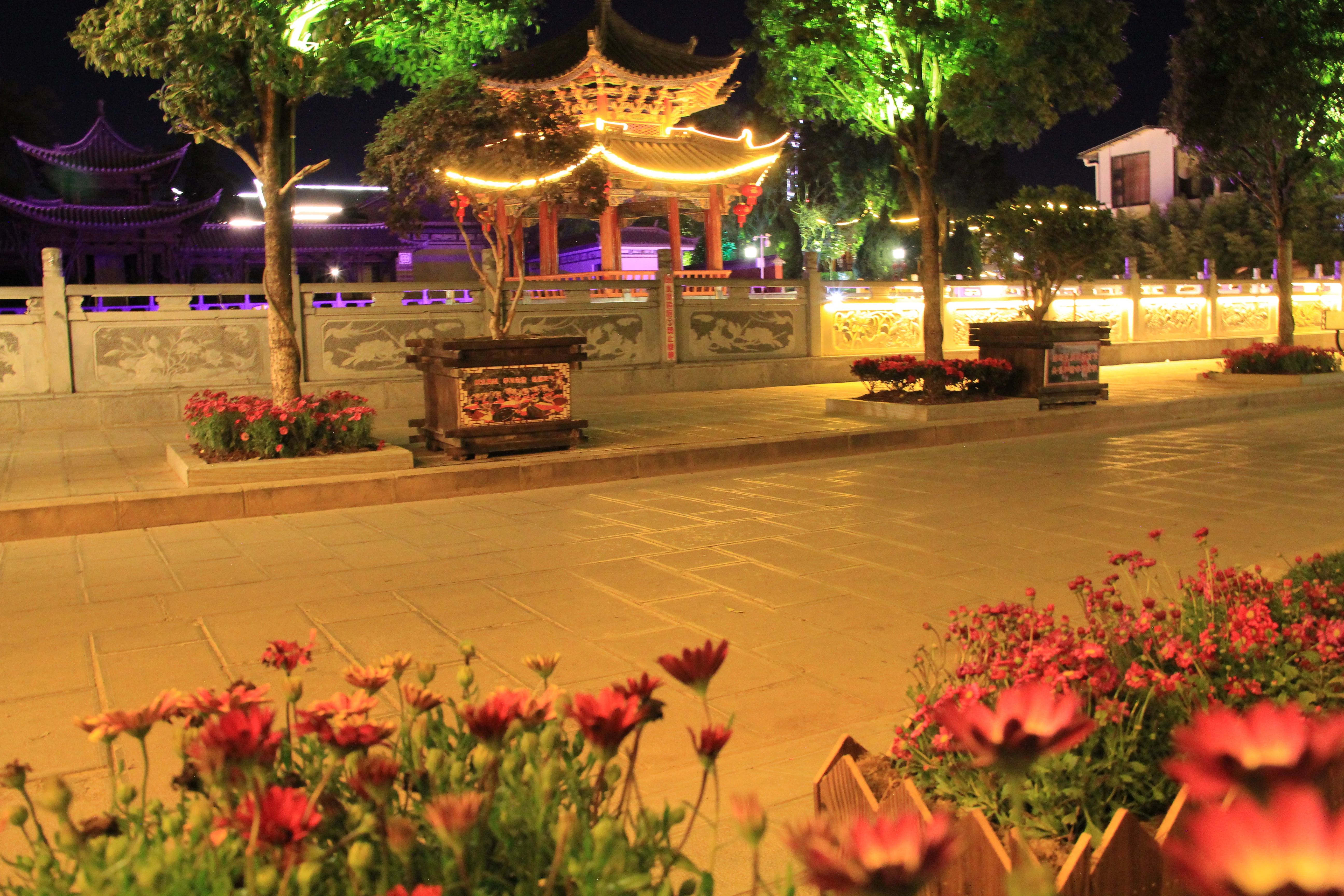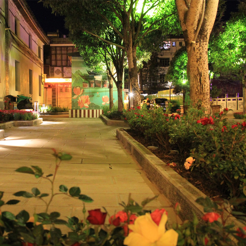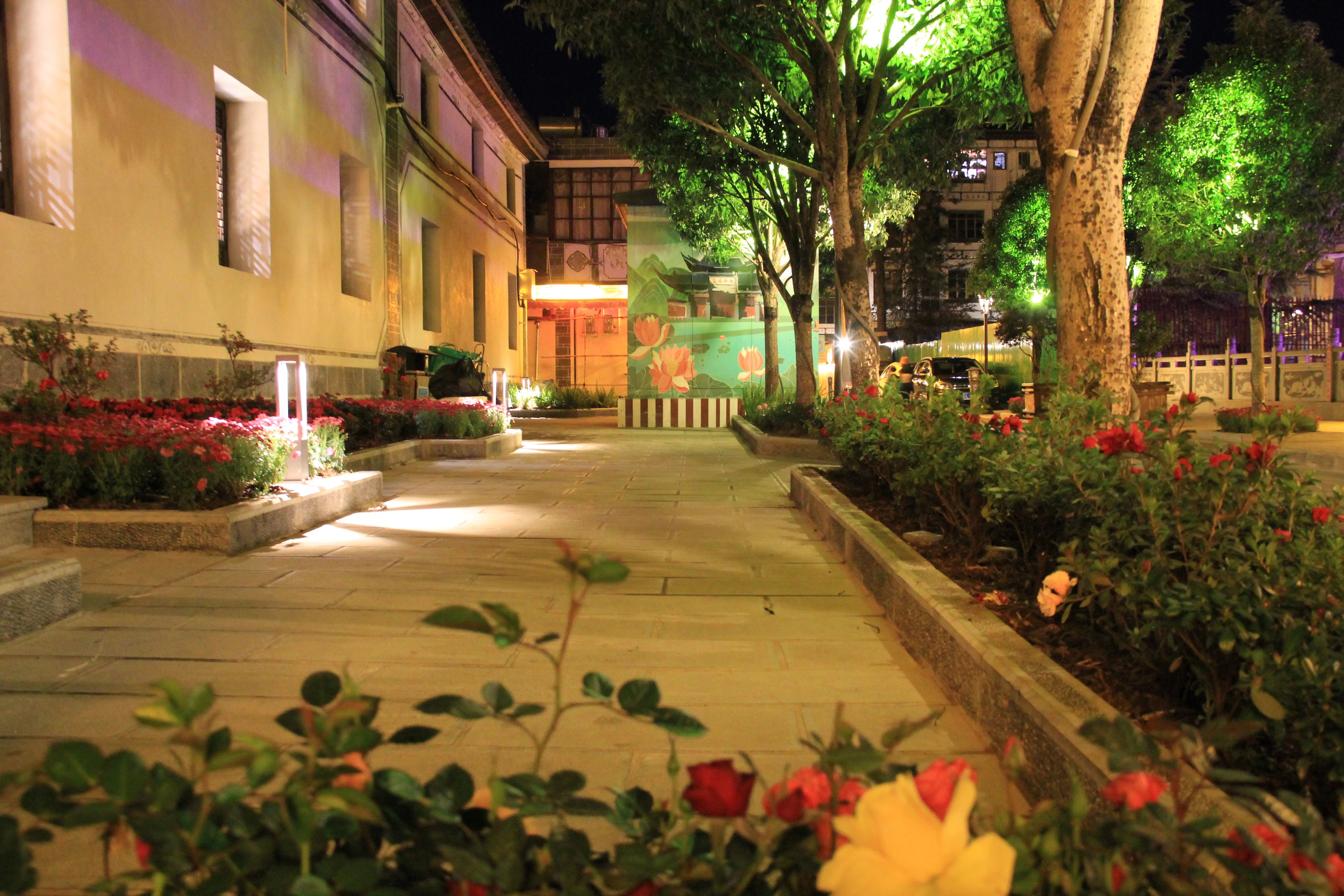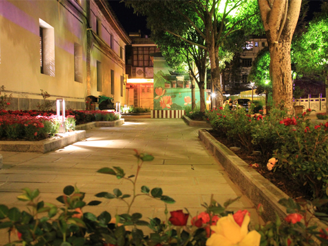 近日,记者在后街看到,造型各异的景观灯灿若星辰,带有鹤庆人文风情的墙画在灯光的照射下,更显其魅力,新栽种的七彩菊花竞相绽放,把整个后街装扮得五彩斑斓,茶马古道广场流光熠熠。
