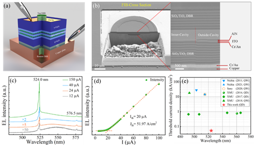 在本工作中,使用S-K模式下进行生长的InGaN量子点(QD)作为有源区,有效减小极化电场并提高发光效率,实现了绿色GaN基VCSEL在连续电流注入下的室温低阈值激射,阈值电流密度仅为51.97 A/cm2,激射波长为524.0 nm。所使用的自组装InGaN QD外延片,其高IQE以及类δ函数的态密度是实现低阈值电流的关键。
