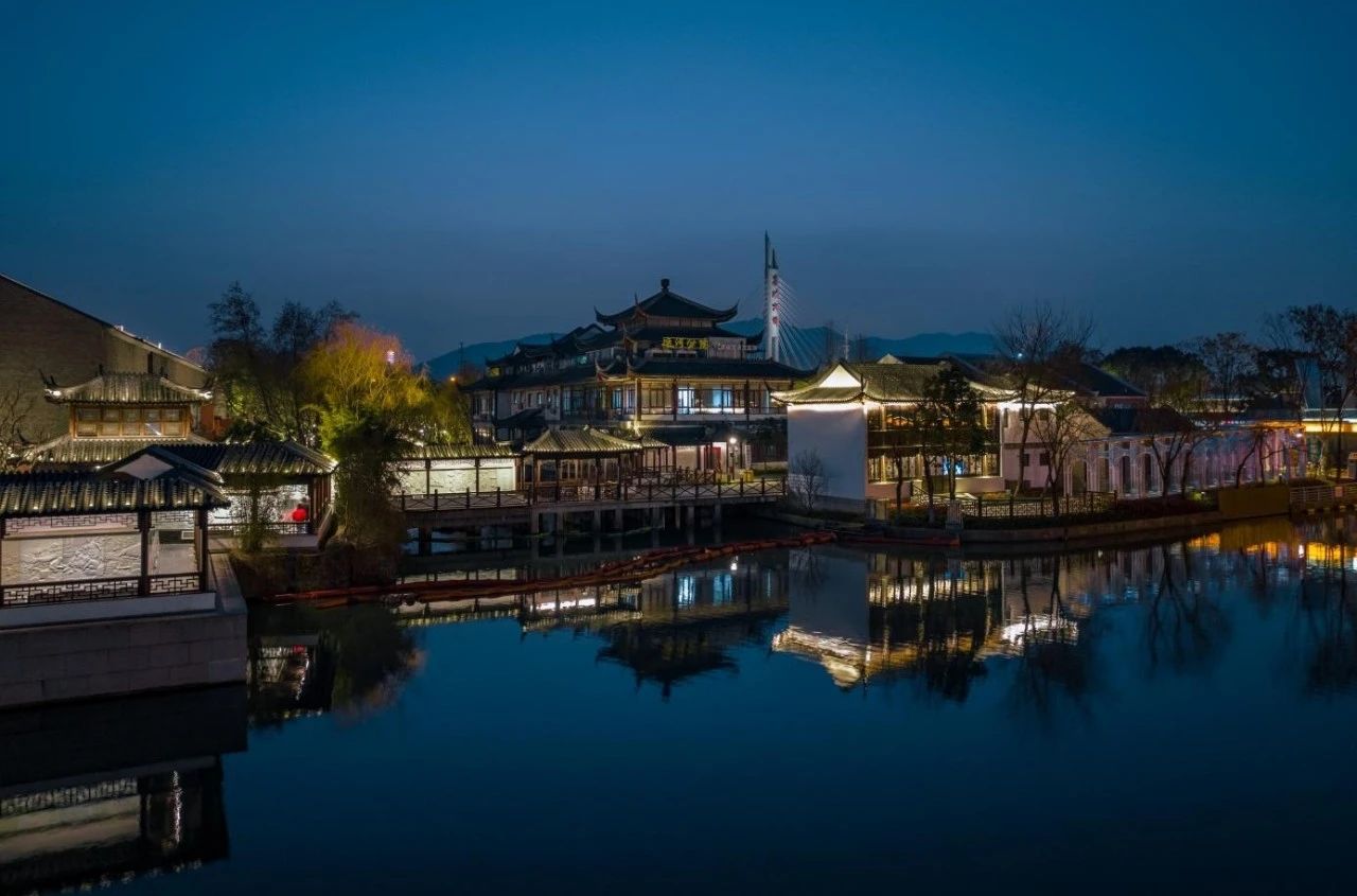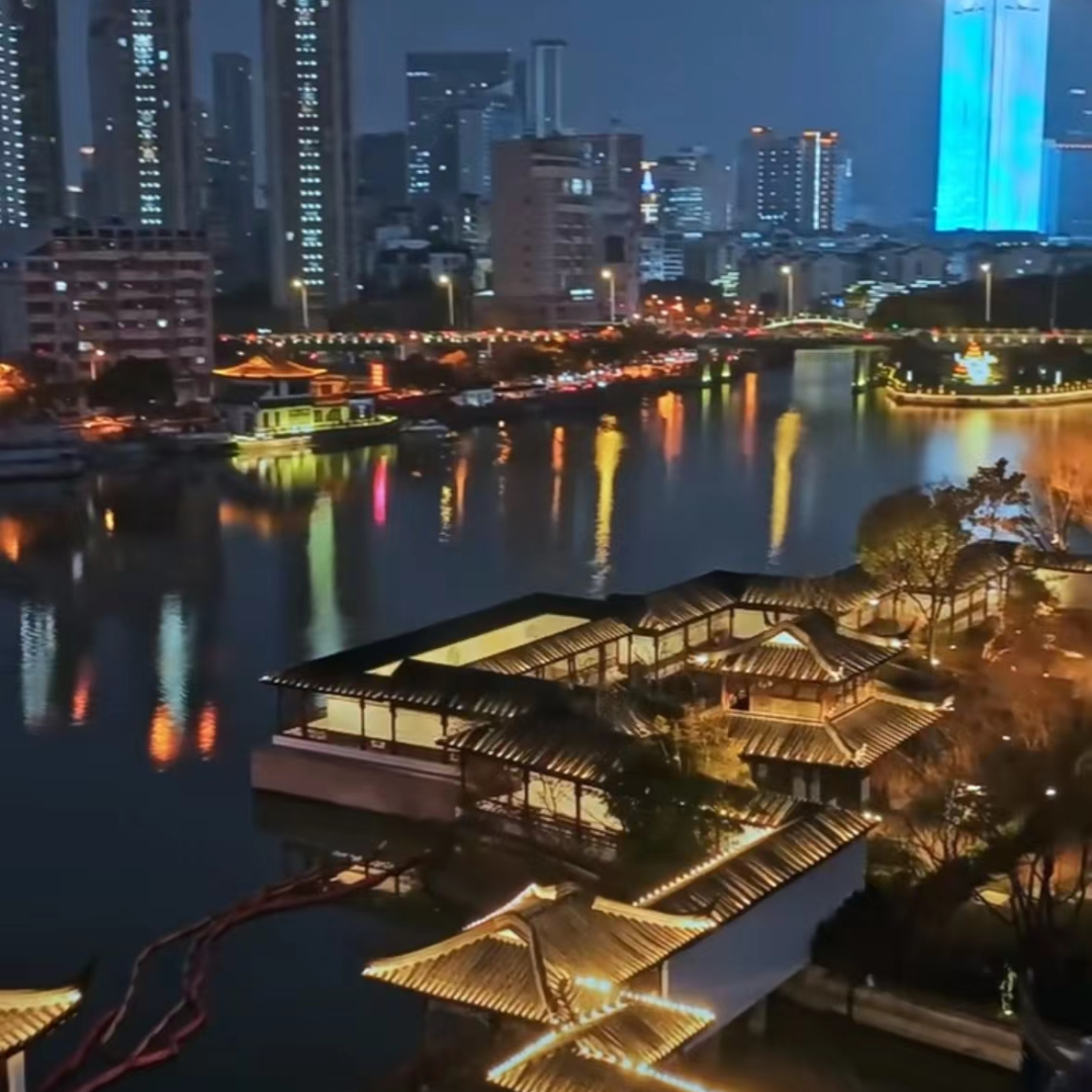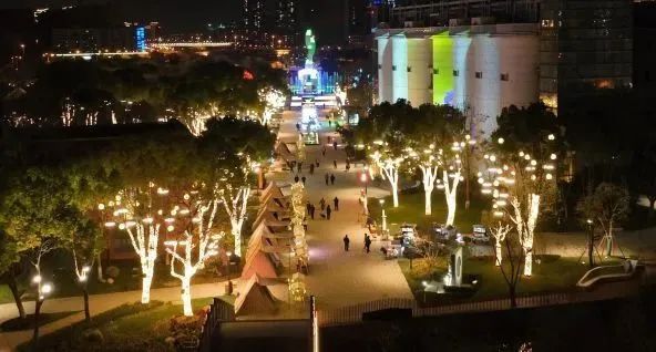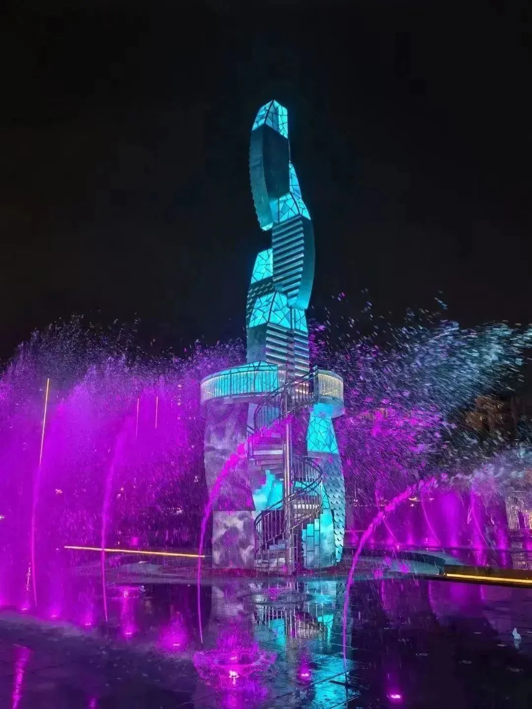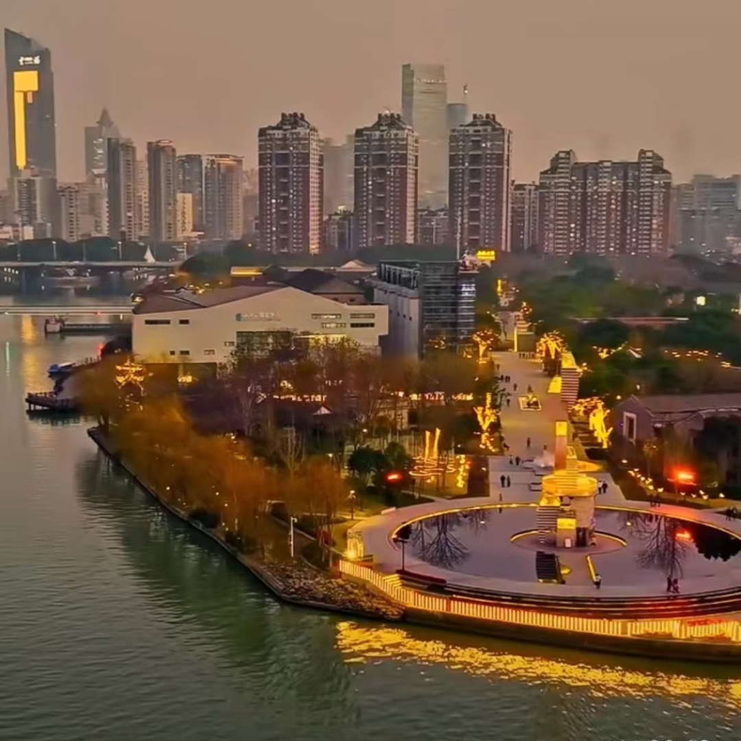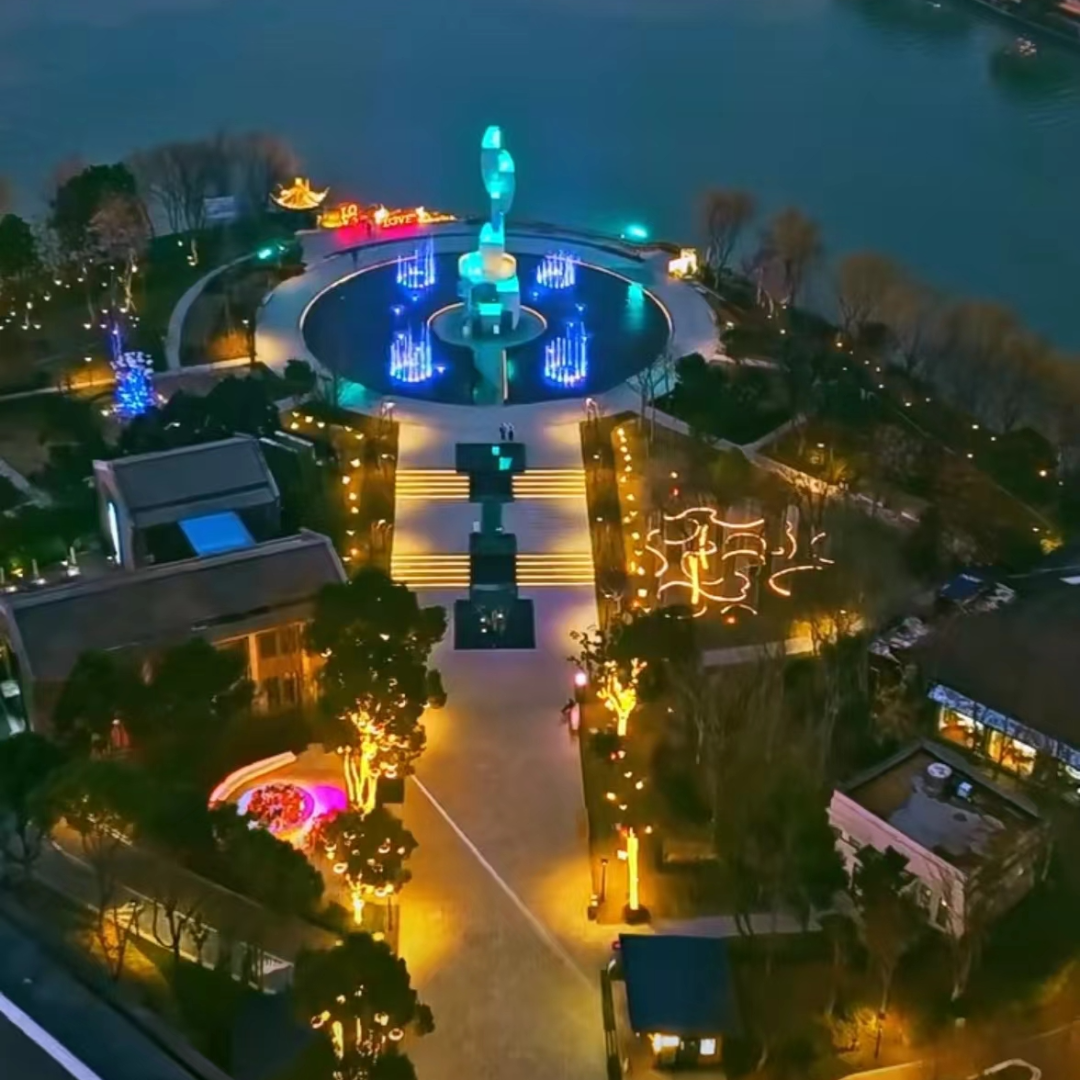 运河公园的“渔之颂”主广场上,喷泉将水的灵动与江南的柔美,展现得淋漓尽致。与黄埠墩交相辉映,上演一场灯火璀璨的光影秀。