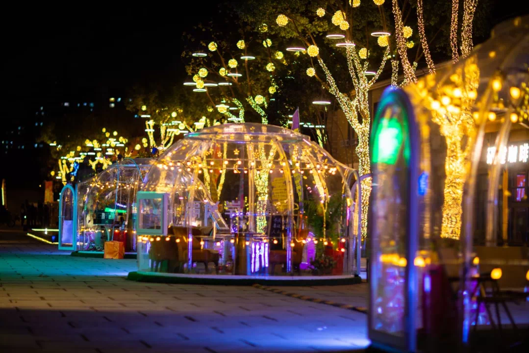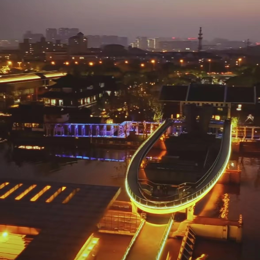 夜幕降临,华灯初上,运河艺术公园流光溢彩,兼具自然之妙与艺术之美。