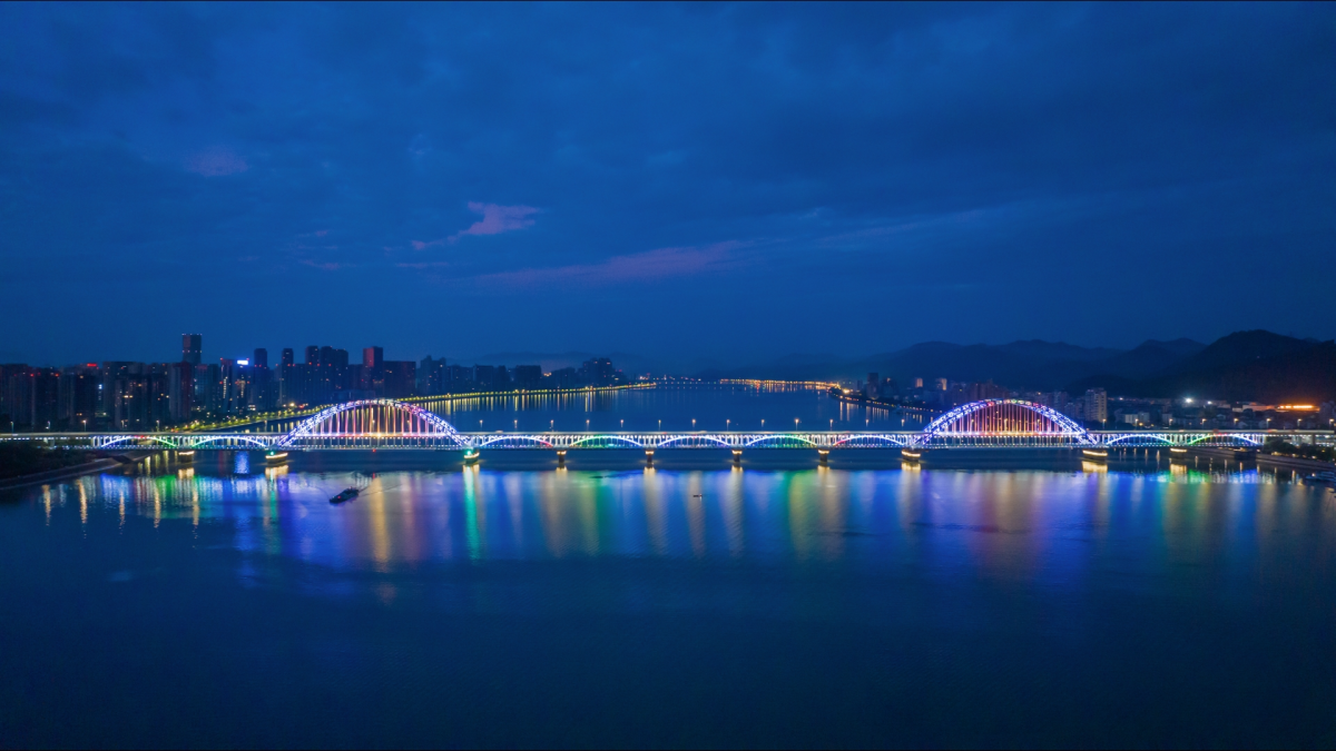 灯光设计时,在确保大桥整体景观效果与钱塘江自然风光的和谐统一之上,运用了七彩变化、流水潺潺等梦幻效果,如彩虹横跨江面,与周围环境相呼应,形成一道城市独特风景。